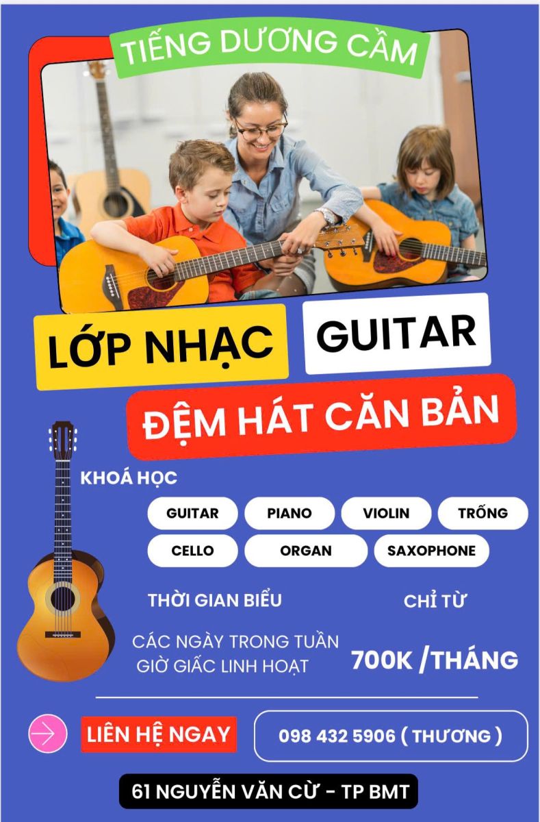 Bạn đang tìm lớp nhạc uy tín tại Buôn Ma Thuột (BMT) để học guitar, piano, organ hay các môn nhạc cụ cho trẻ em và người lớn? Bạn muốn được học trong môi trường thân thiện, thầy cô tận tâm và thời gian linh hoạt? Hình ảnh lớp học trong poster cho thấy không khí vô cùng vui vẻ – nơi học viên nhỏ tuổi đến người lớn đều có thể bắt đầu con đường âm nhạc một cách dễ dàng và tràn ngập cảm hứng.